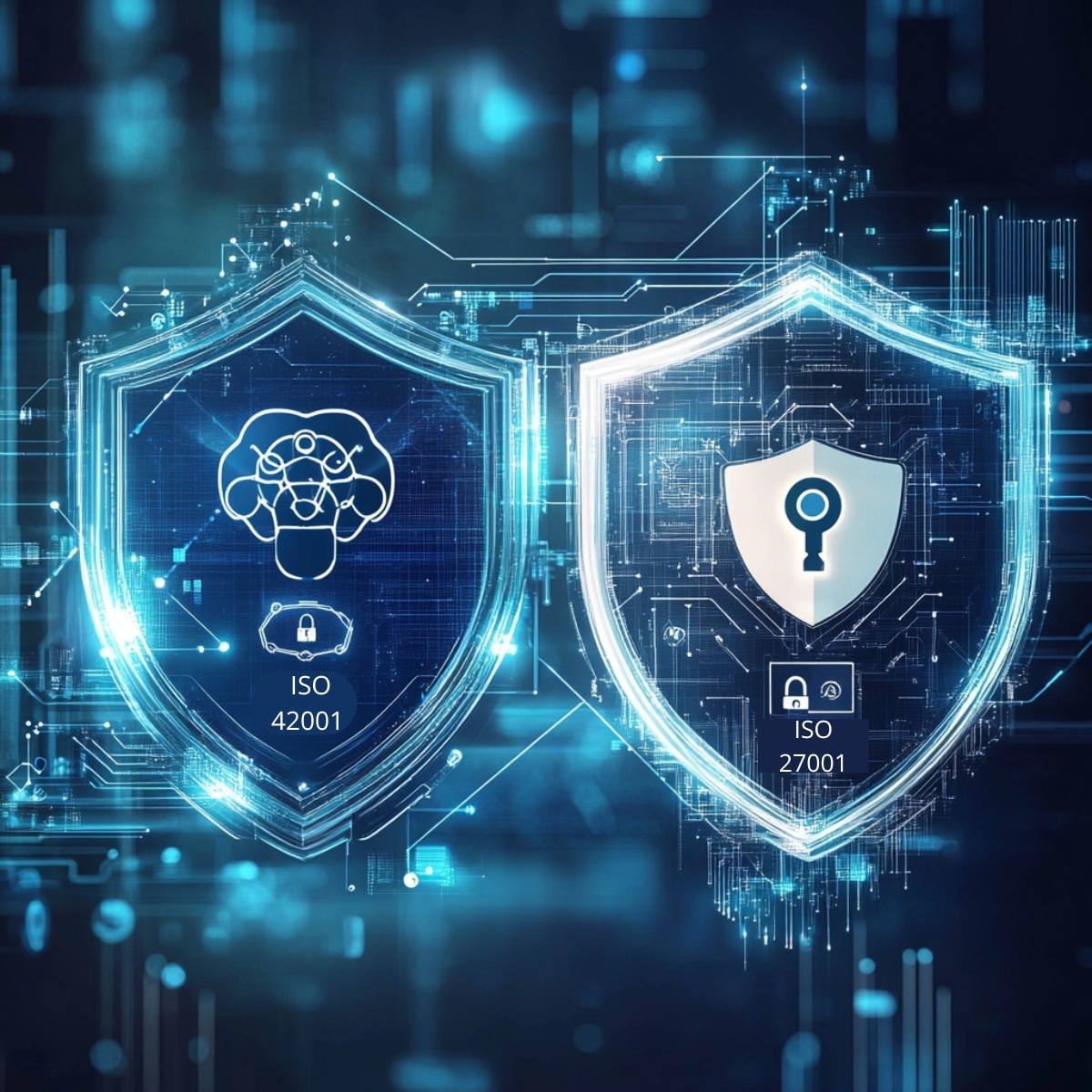 Una comparación entre ISO 42001 para la gobernanza ética de la IA e ISO 27001 para la seguridad de datos, orientando a las empresas hacia una gestión tecnológica responsable y segura.